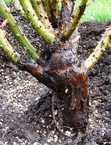 So there is actually a very easy solution to this problem. To prevent unwanted sprouting from the rootstock, just avoid planting grafted roses! The latter are easy to recognize because they bear be a rather obvious swelling at their base (the bud union), that is, where the desired rose was grafted onto the smaller-flowered rootstock. If you’re having trouble seeing the difference, ask the nurseryman to point out some non-grafted roses.