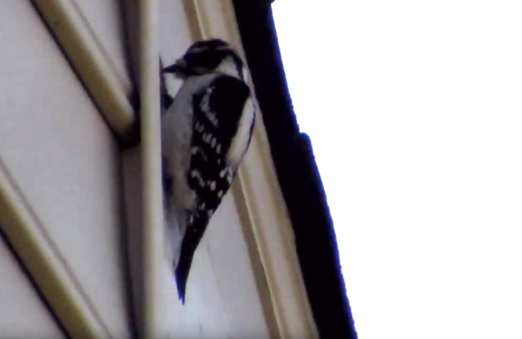 Downy woodpecker drumming on siding. Source: Wes Clark, www.youtube.com