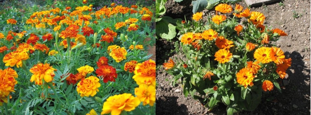 Both of these are marigolds, but are in fact very different plants. Tagetes patula (left) and Calendula officinalis (right).