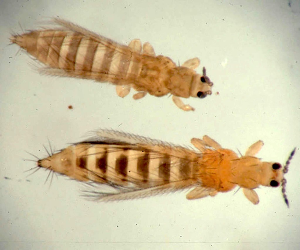 Onion thrips (Thrips tabaci), top, and western flower thrips (Frankliniella occidentalis), bottom are typical thrips, none to easy to tell apar! Photo: Thrips: www.gardentech.com