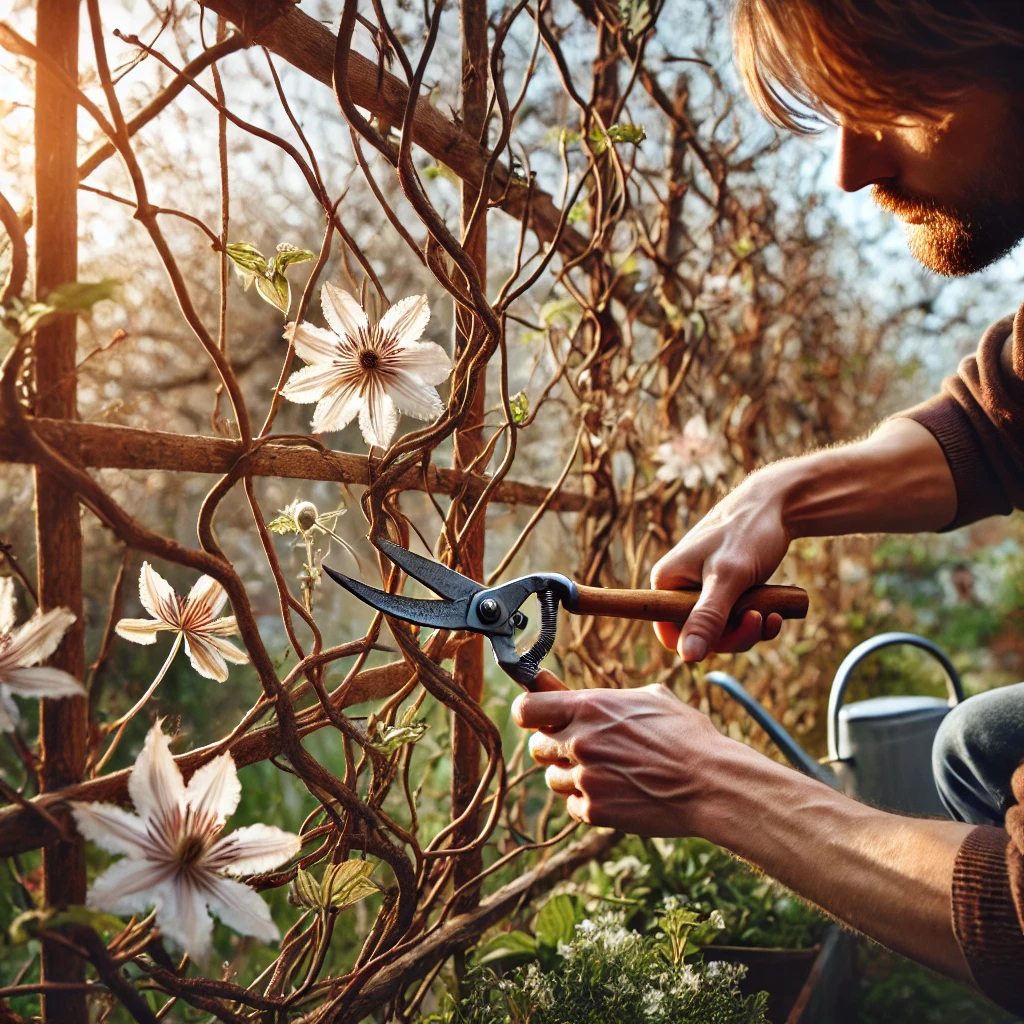 When it comes to pruning, save that task for spring. You’ll want to take a look at your plant and remove any dead or damaged branches then. And if your clematis belongs to group II (the types that bloom on new wood), you can prune it back pretty hard in the spring, since they flower on fresh growth. But for other types, like group I clematis that bloom on old wood, be careful not to go too wild with the shears. A light pruning is all you need, or you might cut off potential flowers for the season.