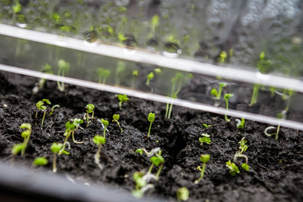 Place your pots in an airtight tray or cover with a plastic dome. Place in a warm, well-lit spot, but not yet in direct sunlight, or under a fluorescent lamp.