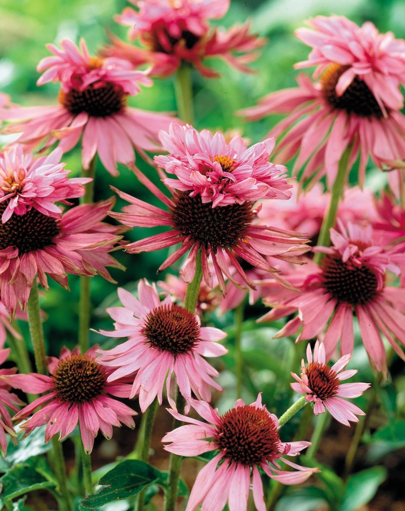 This is a rather special cultivar of echinacea called Echinacea purpurea ‘Doppelganger’ (usually sold under the name ‘Doubledecker’, but its real name is ‘Doppelganer’). The cultivar ‘Indiaca’ is very similar, but its flowering is less uniform. The flowers of this plant appear normal (with pink rays at the base and a raised yellow disc in the center) at the beginning of the season, but as flowering progresses, additional rays begin to appear at the top of the disc. Thus, the flower ends the season with two tiers of blooms.
