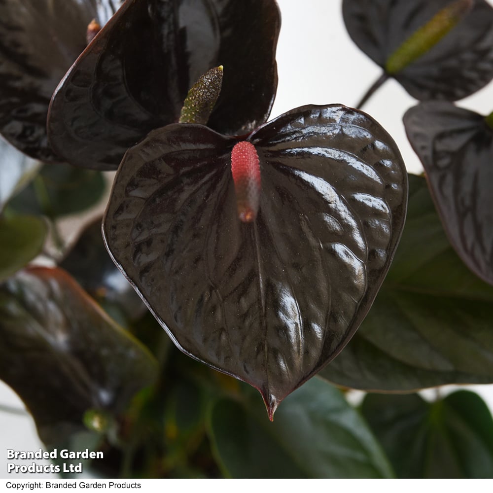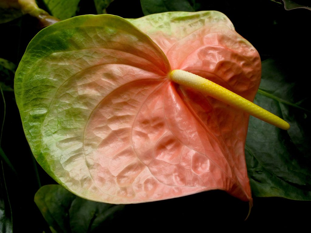 Generally, anthuriums sold on the market are an assorted mix of colors—red, various shades of pink, and white—and are not specifically identified. However, it’s possible to find cultivars that are properly identified. For instance, the cultivars ‘Casparo’, ‘Felicita’, and ‘Delicata’ have bright red flowers. The ‘Maine’ cultivar has dark pink flowers; the ‘Purple Plum’ cultivar has purple flowers; and the ‘Midori’ cultivar has flowers that range from green to white to pink. There are even sumptuous varieties with striped spathes that are commercially known as “candy cane” flowers! These are actually cultivars from the ‘Livium’ series. Finally, there are cultivars like ‘Black Love’ with nearly black flowers and ‘Fiducia’ with lime green flowers.